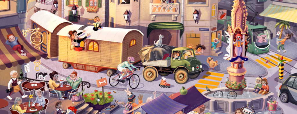 1. Unterwegs: Das Zirkuswagen-Gespann und der VW-Bus im Verkehrsgetümmel einer Stadt. –> Erkennst du die Stadt?
